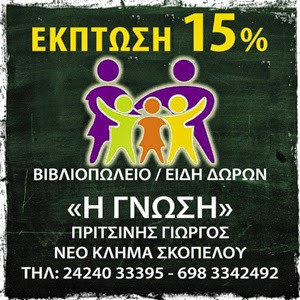Το βιβλιοπωλείο «Η Γνώση» στο Νέο Κλήμα Σκοπέλου πραγματοποιεί έκπτωση 15% σε τρίτεκνους - πολύτεκνους σε όλα τα σχολικά είδη, δώρα και παιχνίδια με την επίδειξη της ταυτότητας.